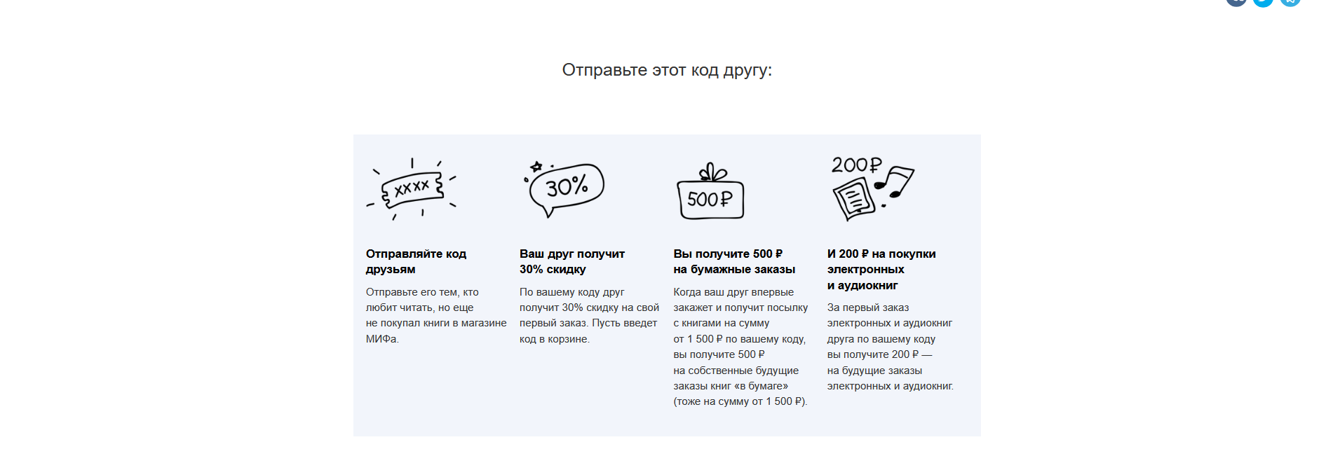 Реферальная программа МИФа: вы получаете денежное вознаграждение, а ваш друг — скидку на первый заказ
