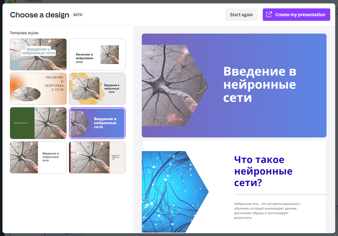 Создадим пустую презентацию и нажмем на значок AI, где выберем можем выбрать Magic Design или Magic Write, рассмотрим первый вариант — пишем тему (если надо русский язык,в конце добавляем «пиши на русском языке») и получаем 8 вариантов оформленной презентации.