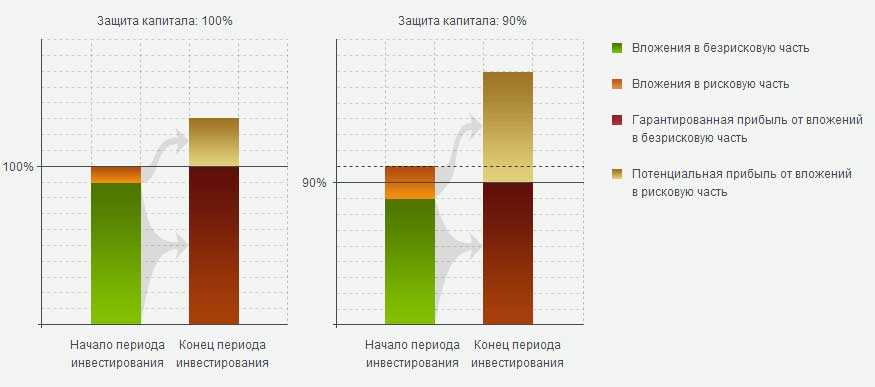 Допустим, что гипотеза управляющей компании не сработала. Тогда инвестор вернёт вложенное с помощью защитной части продукта. Если идея сработала, то инвестор получит заранее определённый процент дохода от рискованной части продукта.
