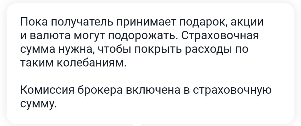 Однако у «Тинькофф Инвестиций» в оферте есть важный момент: когда вы оформляете подарок — цена одна (момент оформления), а когда человек принял подарок и наступил день торгов — цена другая (момент дарения).