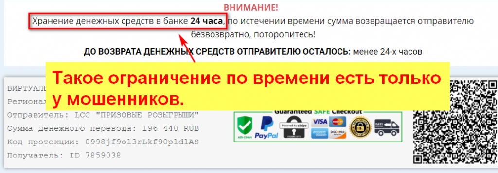 аннулированием выплаты, если не забрать ее в течение 24 часов. Уже это