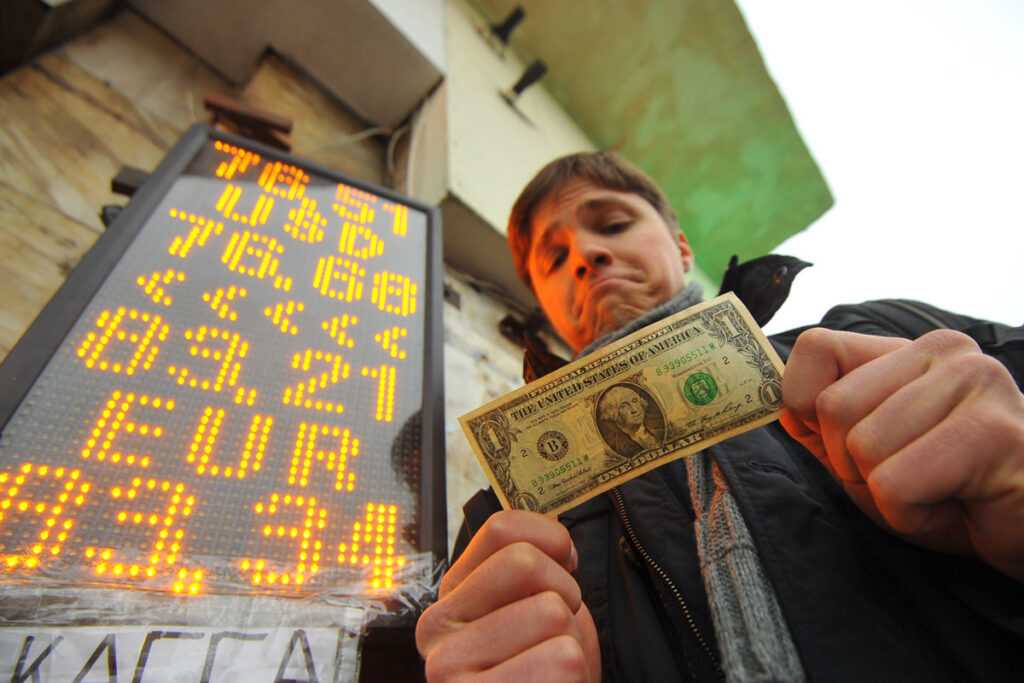 Ìîñêâà. Ìóæ÷èíà ñ îäíîäîëëàðîâîé êóïþðîé ó èíôîðìàöèîííîãî òàáëëî îáìåíà âàëþò.