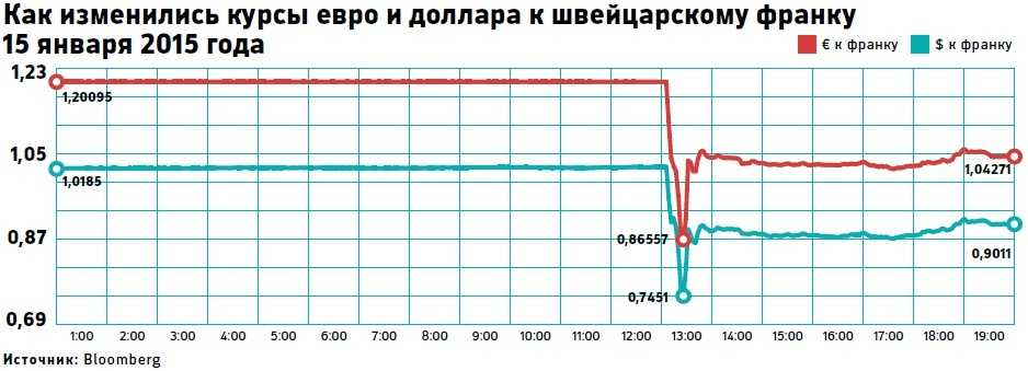 Однако ревальвация бывает и спонтанной. Яркий пример наблюдался в январе 2015 года, когда ЦБ Швейцарии неожиданно принял решение не удерживать курс франка в определенном коридоре. После этого франк укрепился к евро и доллару примерно на треть за считанные минуты, вызвав серьезные потрясения на мировых рынках: