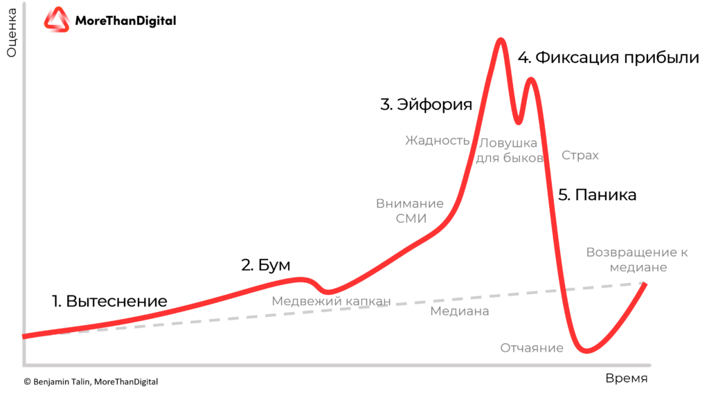 Обычно пузыри можно наблюдать только после того, как они произошли, поскольку не всегда видны их четкие признаки. Но есть убедительные доказательства того, что почти каждый пузырь проходил через одни и те же стадии. Экономист Хайман П. Мински был первым, кто выделил эти 5 стадий, и поэтому мы расскажем о них немного подробнее.