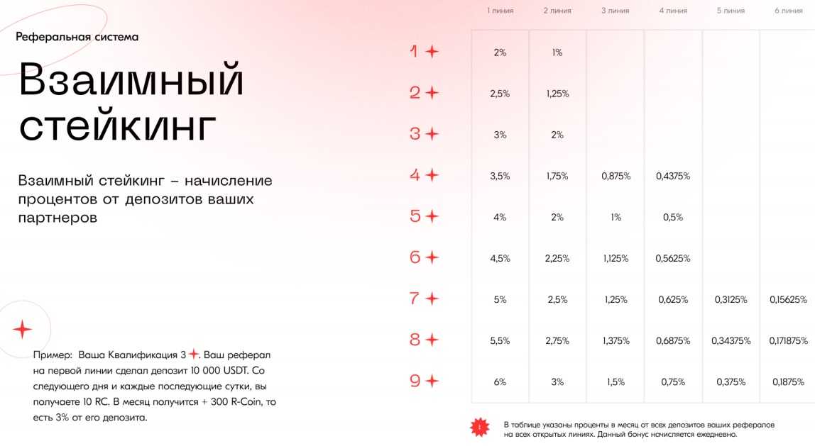 Как работает взаимный стейкинг? Когда человек хранит определенные средства у себя на депозите, он получает вознаграждение в R-coin по заданному алгоритму. Процент начисления зависит от суммы депозита и составляет от 26% до 39% в месяц. Например, если вы положили 1000$, то в течение месяца вы получите 29%, то есть 290 R-Coin (1RC=1$). Чем больше депозит, тем больше процент. Проценты начисляются каждый день. Полученные R-Coin можно конвертировать в USDT по текущему курсу (курс R-Coin до выхода на биржу растет от 1 до 10% в месяц) и снять в любой момент. Сами депозиты невыводные. Сделав депозит один раз, вы будете получать проценты каждый день.