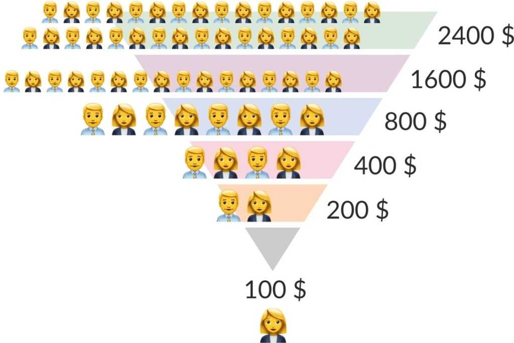 Так может продолжаться до тех пор, пока пирамида успешно рекламируется и в нее постоянно вкладываются новые участники. Если в какой-то момент в пирамиду перестают вкладывать достаточно много, чтобы расплачиваться с последними долгами, — она разваливается. Приведем пример: