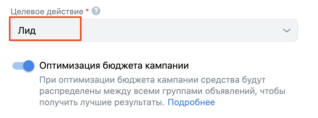 В поле «Целевое действие» выбираем добавленное событие «Лид». Ставим галочку в поле «Оптимизация бюджета кампании».