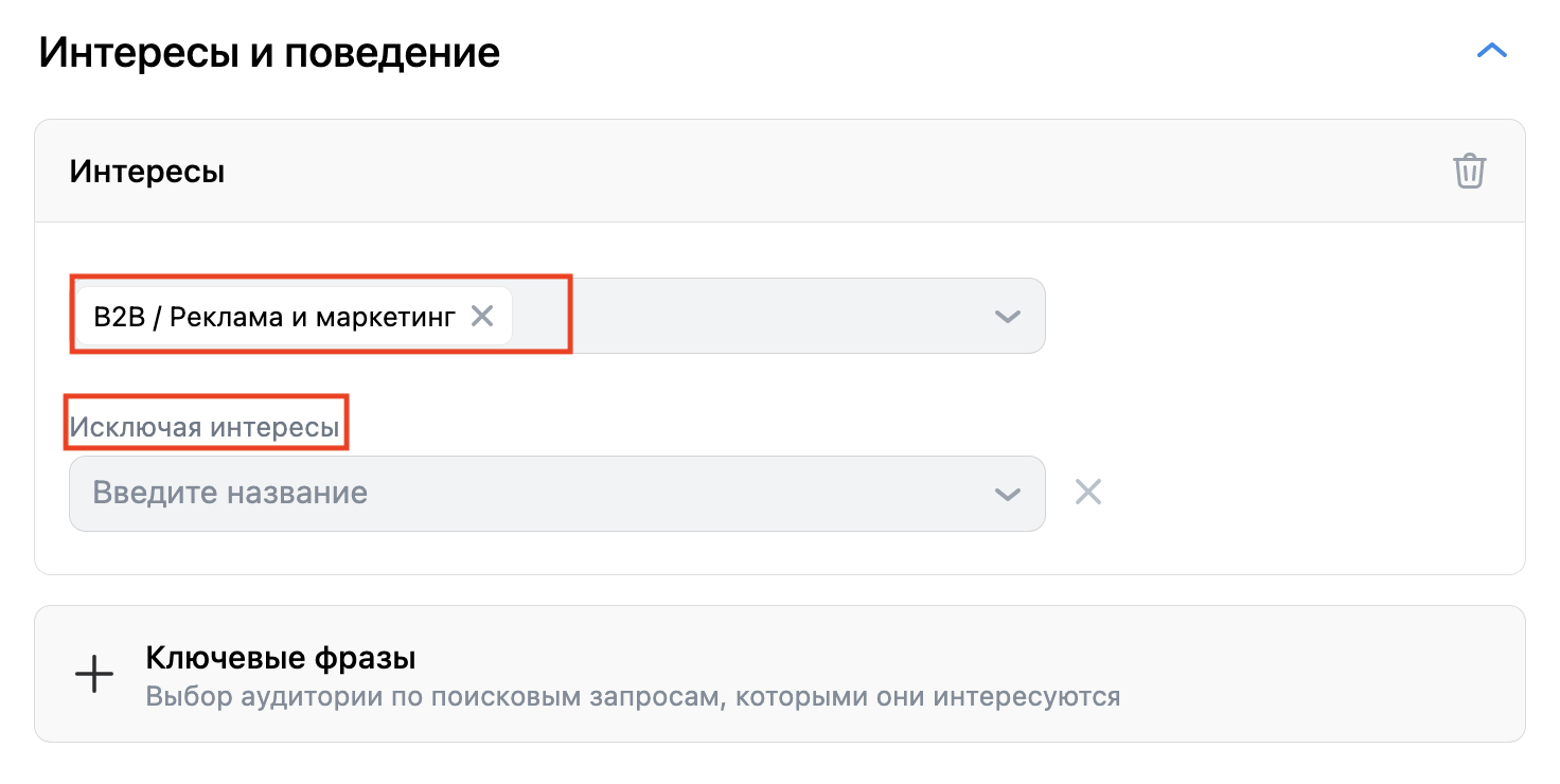 В разделе «Интересы и поведение» добавляем ключевые фразы по вашей услуге. Ключевые фразы — это те фразы, которые пользователь вбивал на различных площадках для поиска информации. Алгоритмы знают, что пользователь это искал и показывает ему нашу рекламу.