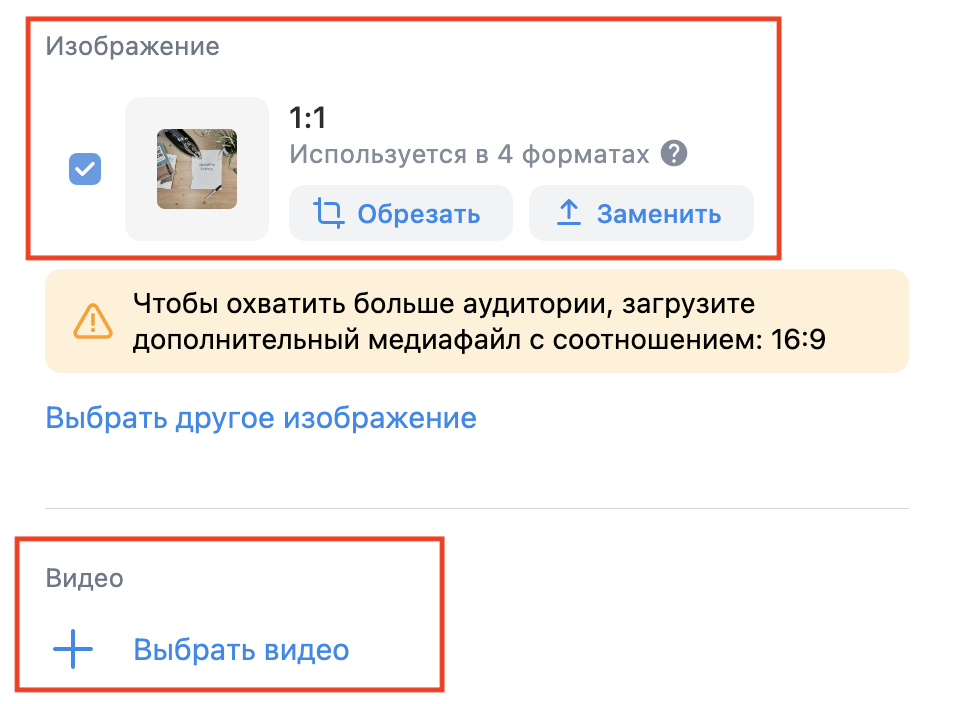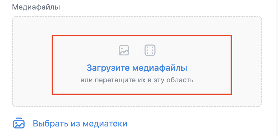 В поле «Медиафайлы» можно загрузить изображения и видео с ПК или выбрать из медиатеки. Минимальный размер изображения – 1080 х 607 пикселей. Подробнее о требованиях к медиафайлам можно почитать в справке VK Рекламы.