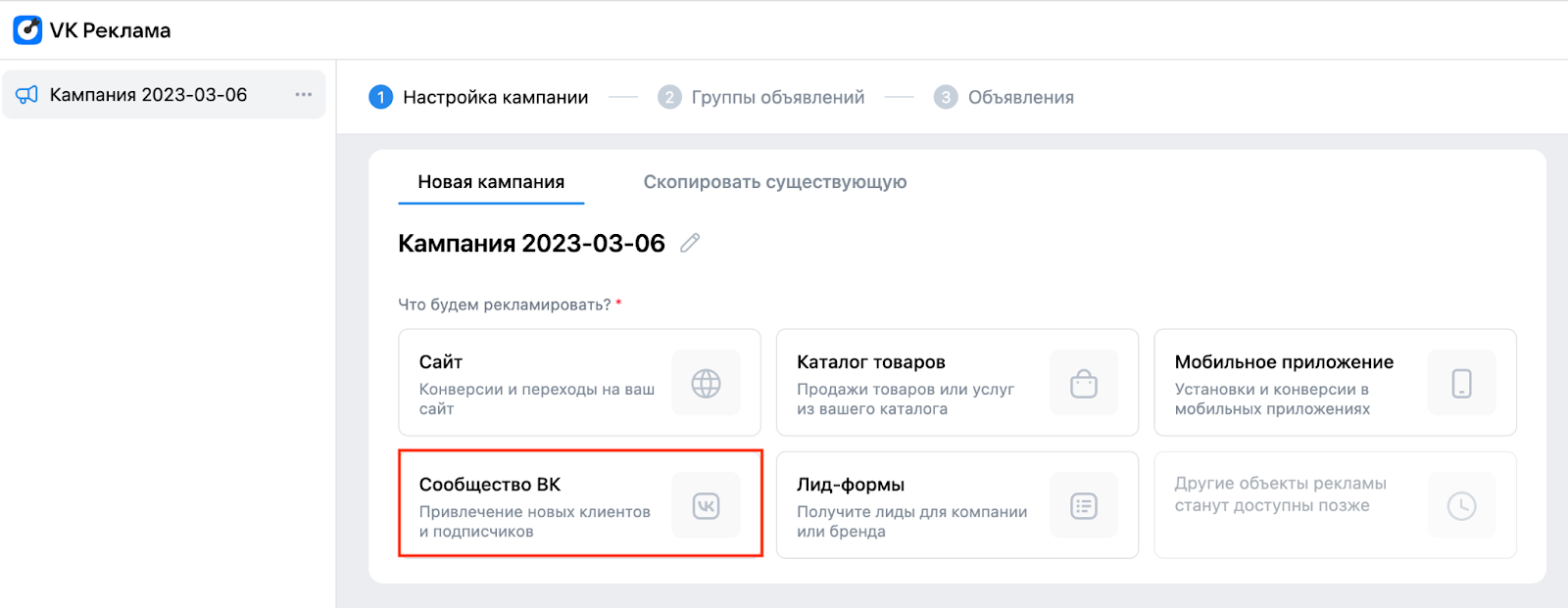 Переходим на вкладку «Кампании» – Создать – Сообщество ВКонтакте.
