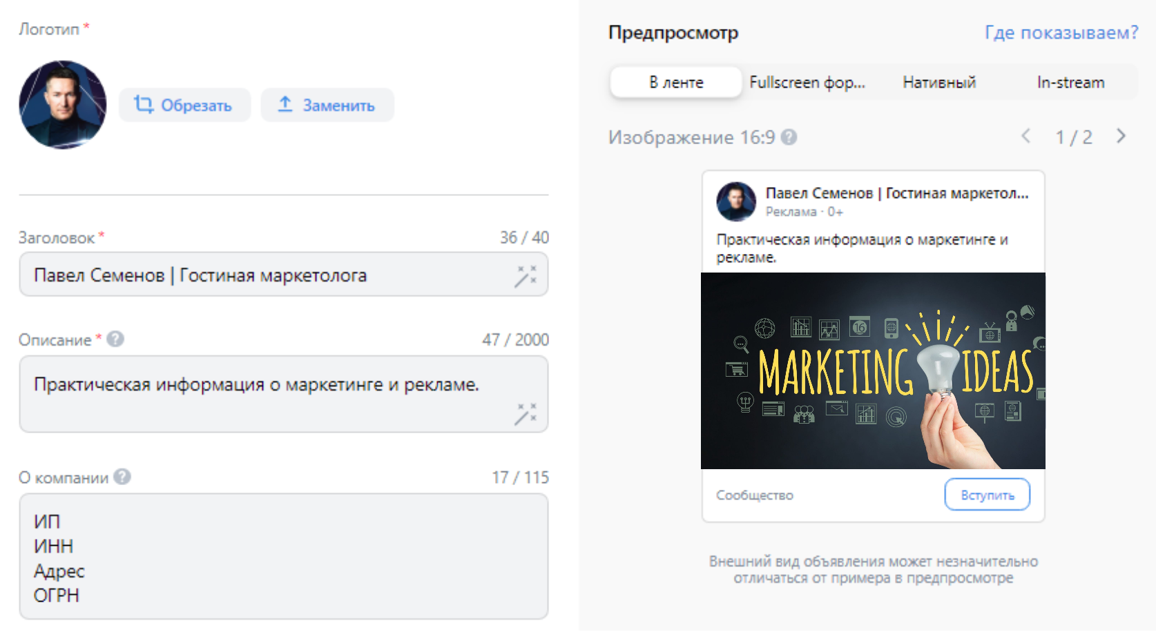 Теперь нужно загрузить логотип компании или аватарку сообщества, заполнить поля с заголовком (40 знаков), описанием (2000 знаков) и поле «О компании» (115 знаков).