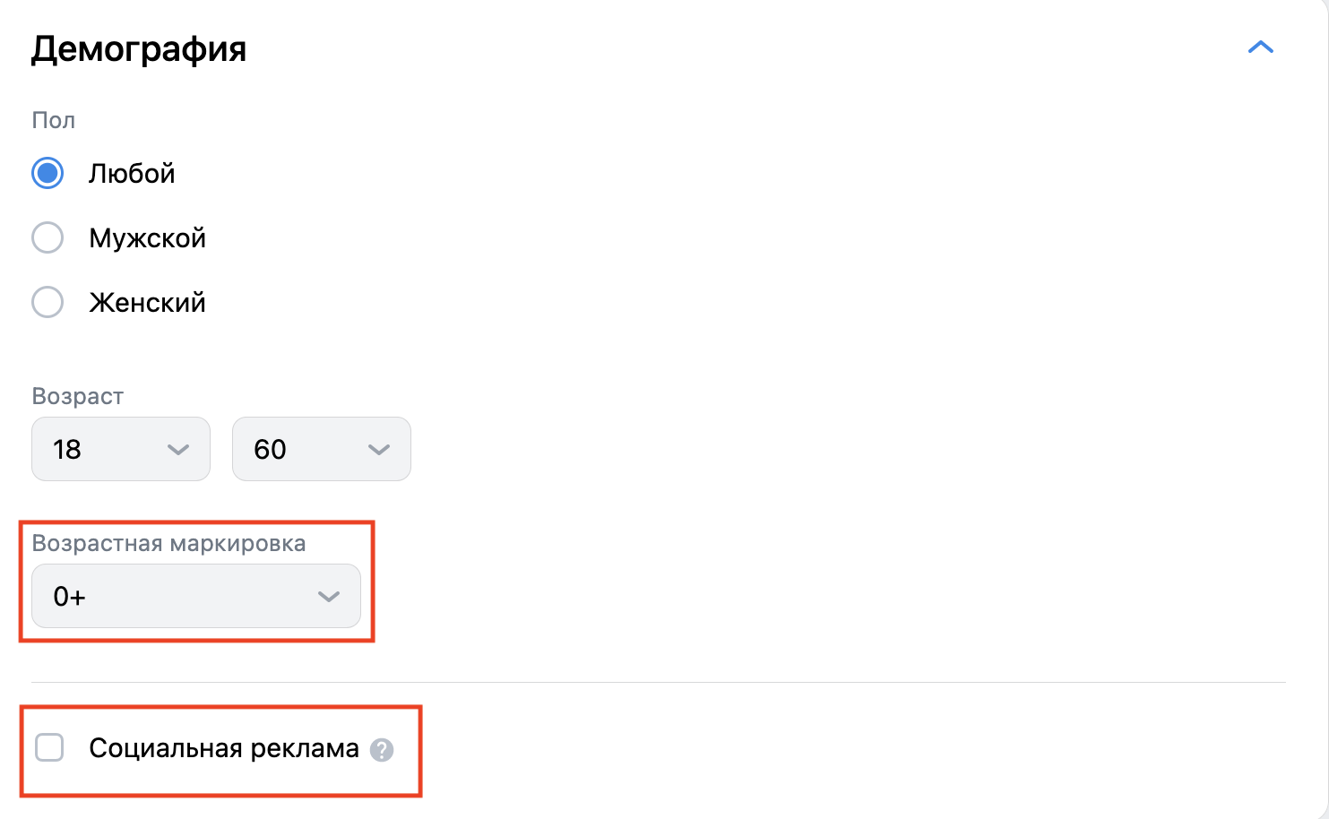В разделе «Демография» указываем пол и возраст аудитории. Здесь же выставляем возрастную маркировку. Если ваша реклама благотворительная и несет пользу обществу, проставьте галочку напротив пункта «Социальная реклама».