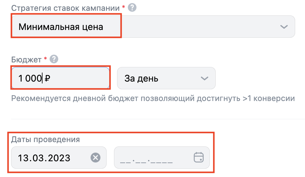 В поле стратегия ставок выбираем «Минимальная цена», устанавливаем бюджет за день и дату проведения кампании.