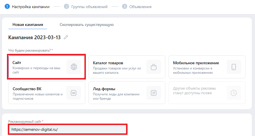 Переходим к настройке рекламы на сайт. Для этого переходим во вкладку «Кампании» – Создать – Сайт. Автоматически подгрузится сайт, на который настроен пиксель.