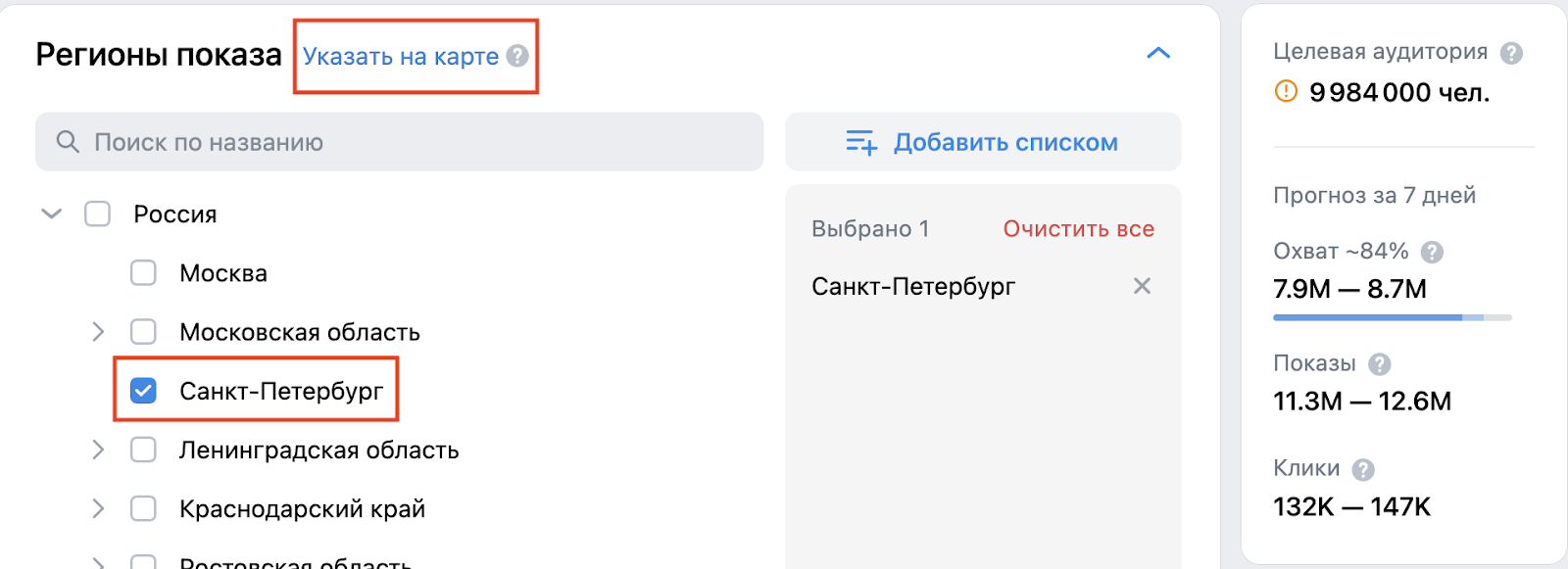Устанавливаем регионы показов. Здесь можно выбрать регион и город из списка или указать местоположение на карте.