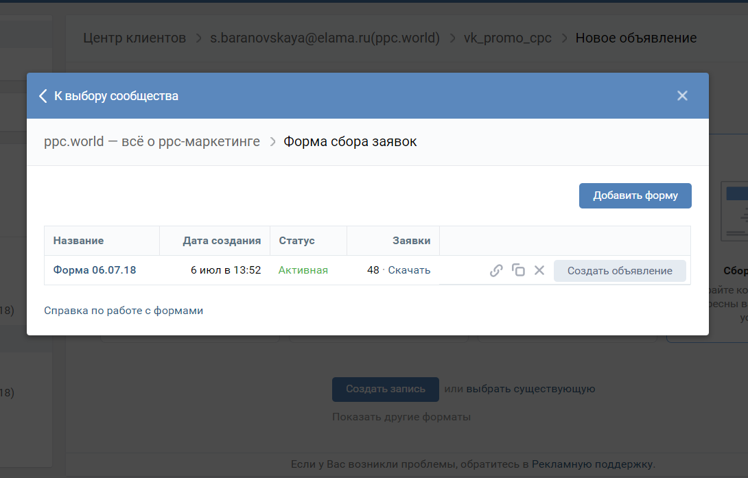 Когда форма готова, жмем «Сохранить форму» в верхнем правом углу. Откроется окно со всеми созданными формами. Выбираем нужную и нажимаем «Создать объявление».