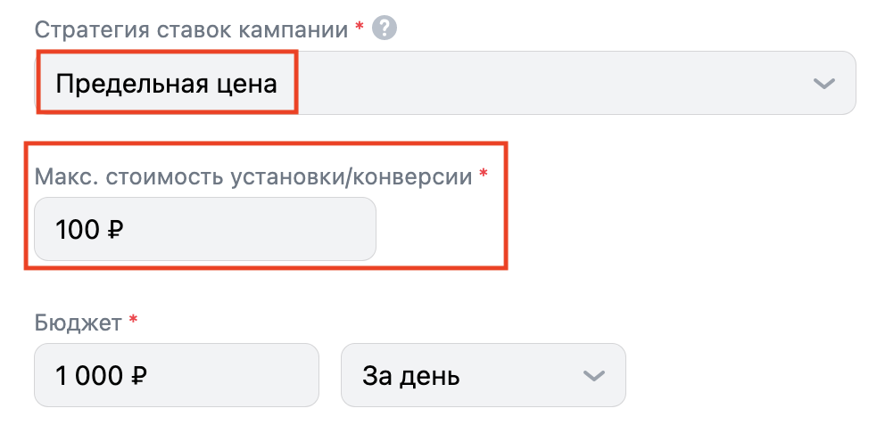 При выборе стратегии «Предельная цена» система будет стремиться достичь наилучших результатов, не превышая указанную цену. Здесь дополнительно нужно указать максимальную стоимость установки / конверсии.