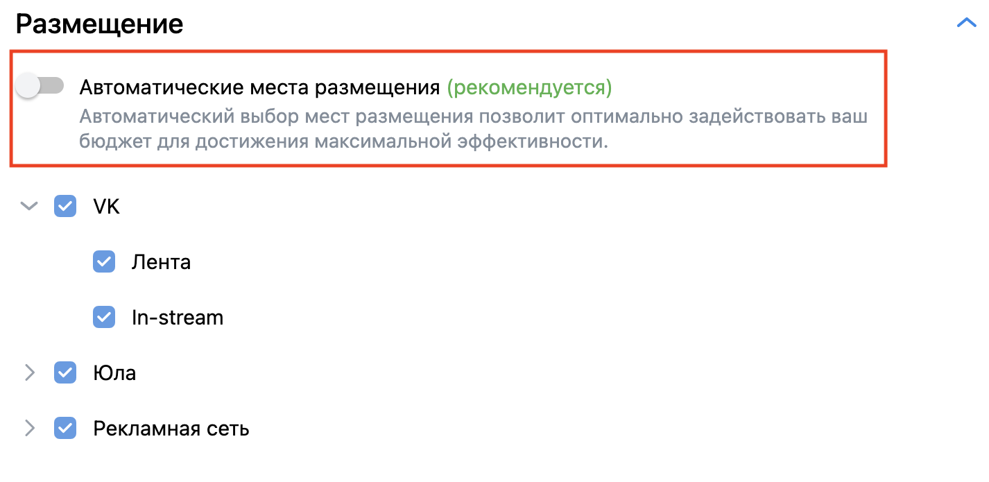Выбираем места размещения. По умолчанию включен автоматический подбор, который позволяет оптимально задействовать бюджет для достижения максимальной эффективности. Также можно выбрать места размещения вручную.