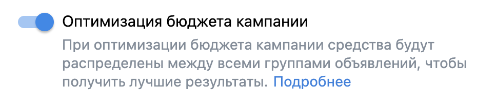 Выставляем бегунок на значение «Оптимизация бюджета». Теперь выделенный бюджет между объявлениями будет распределяться таким образом, чтобы принести больше целевых действий.