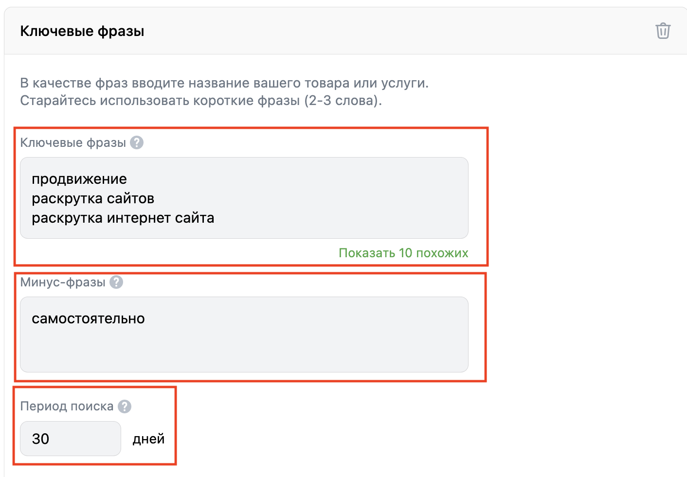 Задаем ключевые фразы в разделе «Ключевые фразы». Они также определяют пользовательский интерес, но уже в течение определенного периода, который задает рекламодатель.