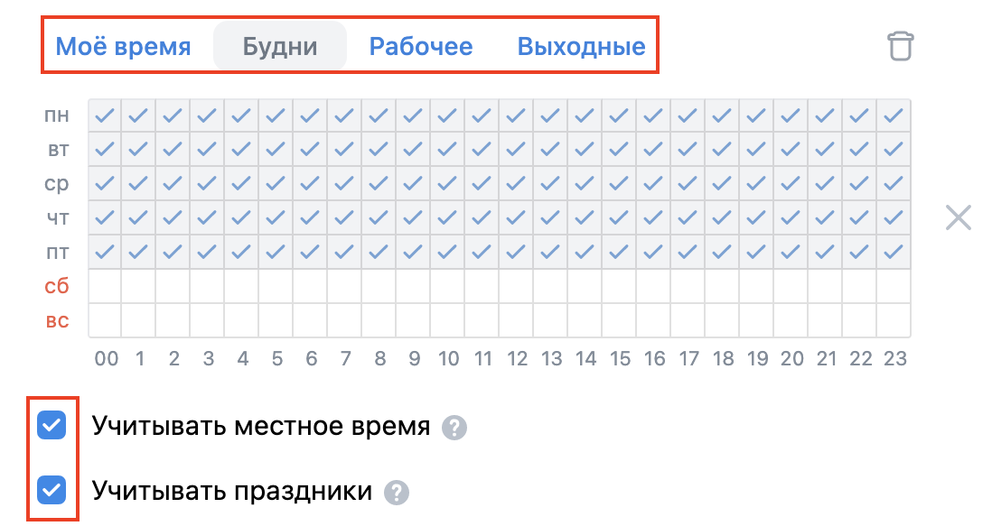 Настраиваем время показов. Для этого открываем ссылку «Настроить время показа» и устанавливаем нужные часы. Здесь можно установить свое время или выбрать шаблонный график: будни, рабочее, выходные. Для учета местного времени и праздников выставляем галочки напротив этих параметров.