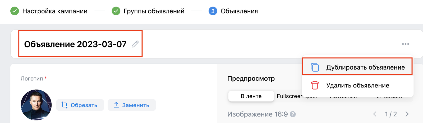 После загрузки изображения в правой части экрана появится предпросмотр объявления. Здесь можно посмотреть как объявление будет показываться в разных местах размещения.