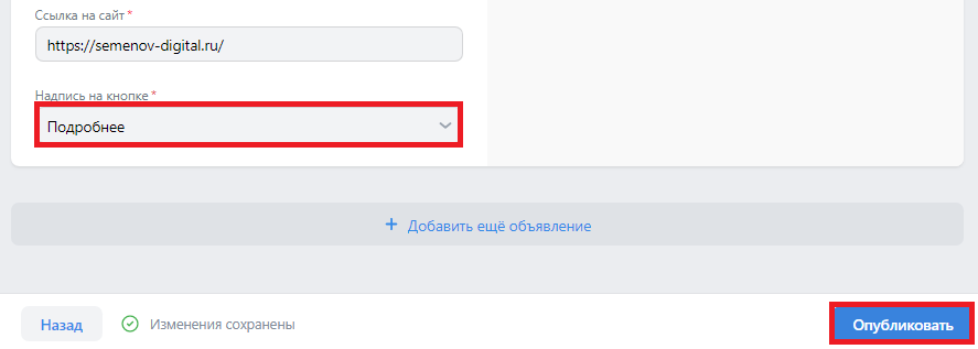 Выбираем надпись на кнопке, например, «Подробнее». Нажимаем «Опубликовать».