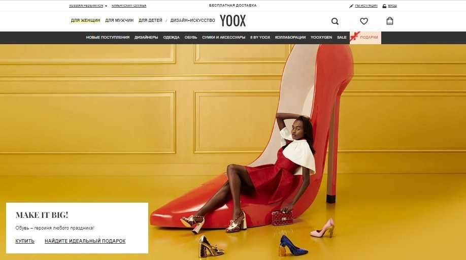 Итальянский мультибрендовый магазин, основанный в 2000 году. Собрал в своем каталоге более 5 000 брендов, включая люксовые Dolce&Gabbana, Maison Margiela, GUCCI, Saint Laurent. Заявленные скидки в Yoox достигают 90 %. У сайта есть русская версия. Доставка стоит 1 000 рублей или бесплатно при заказе от 12 000 рублей.