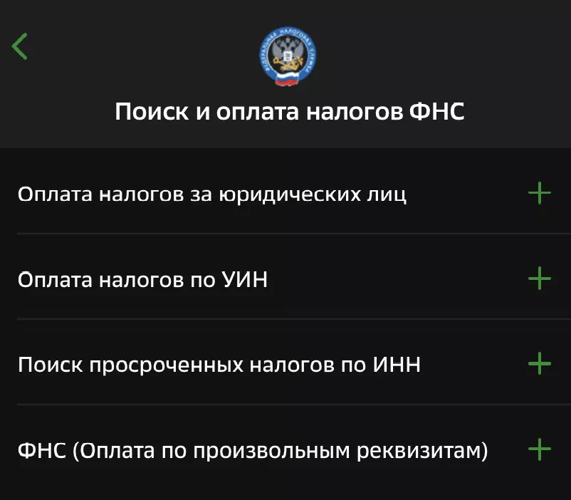 - В каталоге перейти в раздел «Платежи» — «Госуслуги, налоги, штрафы».