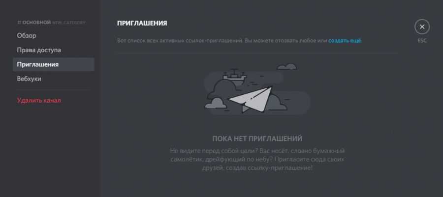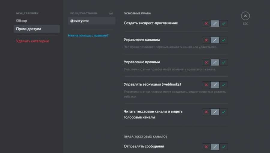 3. В разделе «Права доступа» параметры управления каналом (текстовым и голосовым), сообщениями, подключениями и др.