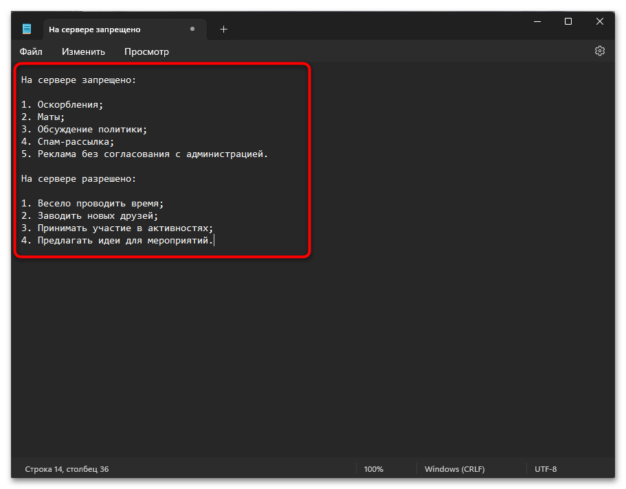 Сами правила рекомендуется заготовить заранее. Для этого используйте любой текстовый редактор, найдите референсы или сравните правила на других серверах, где сами являетесь участником. Персонализируйте их, добавьте элементы оформления или какие-нибудь другие детали, которые считаете нужными.