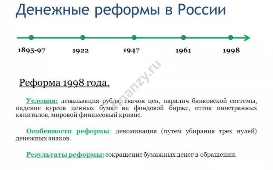 - Из оборота выводятся старые бумажки и монеты, а взамен выдаются другие денежные единицы.