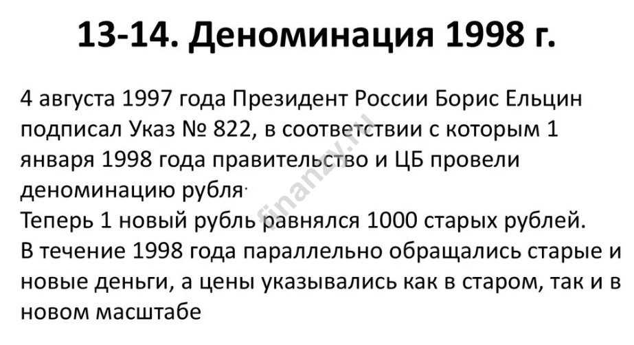 Еще до мирового кризиса в 1998 год первые слухи о деноминации валюты появились еще в начале лета 1996 года. Специалисты отмечали, что такой процесс возможен только через два года, что и произошло на практике. Так, 4. 08.1997 года Президент РФ Ельцин Б. Н. подписал указ, запускающий процесс деноминации. Первые обменные операции в банке начались с января 1998-го, а конвертация производилась в отношении 1000 к 1. Иными словами российский рубль лишился трех лишних нулей. На 1000 старых рублей можно было получить только 1 рубль.