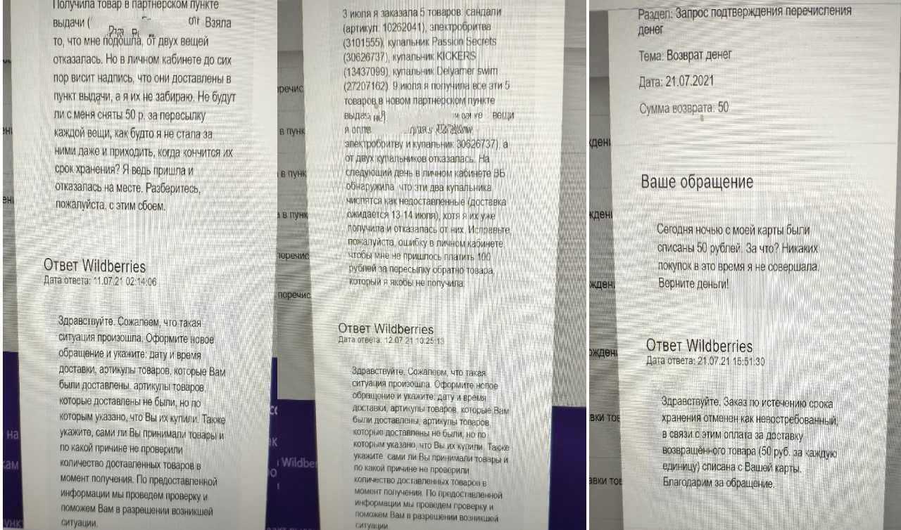 С меня списали 50 рублей. Прямо с карточки, в 6 утра, без всякого предупреждения. На следующий день списали ещё 50 рублей. Я написала в поддержку, мне ответили, что это как раз за те купальники, которые я якобы вовремя не забрала. И в это же время наконец-то пропала картинка, что они никак мне не доставятся. Типа одномоментно они мне доставились, полежали до срока хранения, не дождались, что их заберут, и отправились обратно, прихватив мои 100 рублей.