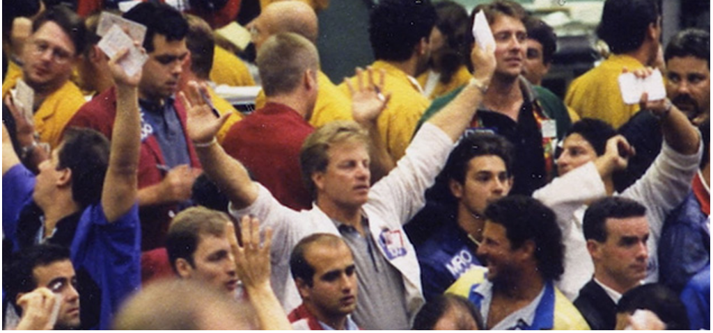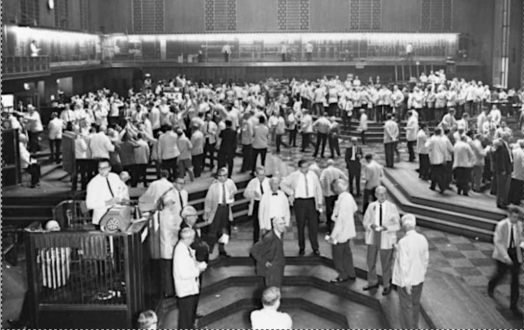Тогда торги велись в так называемых биржевых ямах. Это часть торгового зала биржи, которая находится чуть ниже по уровню, чем остальное пространство. По правилам открывать и закрывать сделки можно было только там.