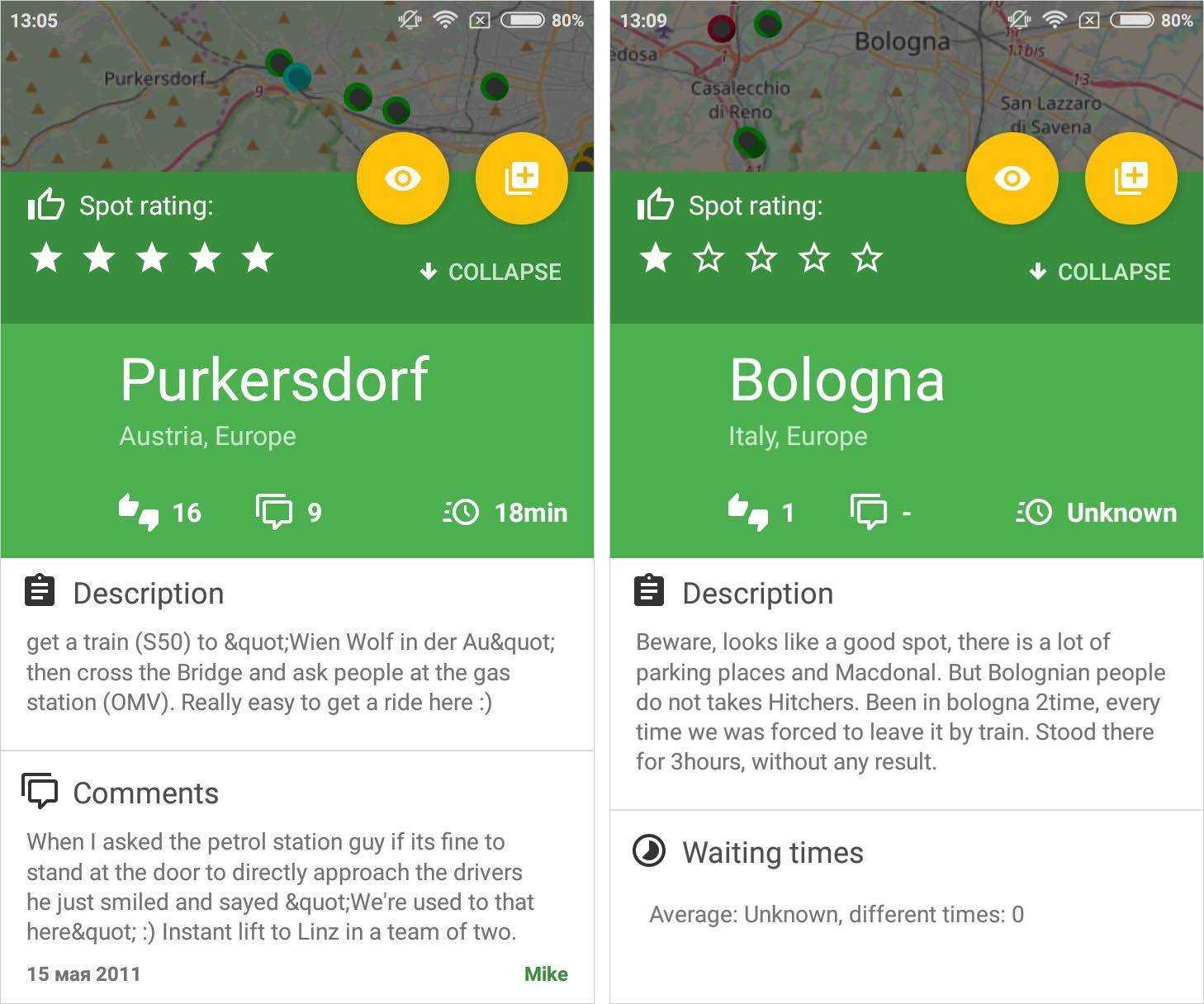 Еще есть приложение для смартфона Hitchhiking Maps. Там указаны 18 420 точек для автостопа в Европе. Каждое место я изучаю в режиме просмотра улиц, там же указано среднее время ожидания машины, есть комментарии путешественников и сравнительный рейтинг. Бывают зеленые, желтые и красные точки.