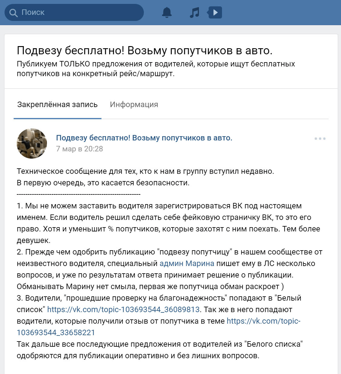 Правила безопасности в сообществе по поиску попутчиков во Вконтакте