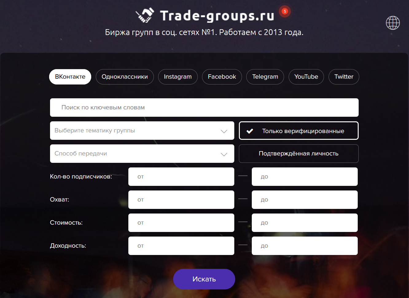 Ещё одна площадка с полным набором фильтров и полноценным поиском по ключевым словами. Сообществ на продажу много, так что найти тут можно практически всё, что только угодно. Стоит отметить, что среди прочей статистики по сообществам, есть возможность просматривать различные источники расходов и доходов группы. А также использованные методы раскрутки и продвижения. Гарантии биржа представляет в двух возможных вариантах: