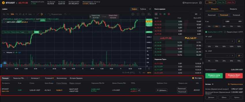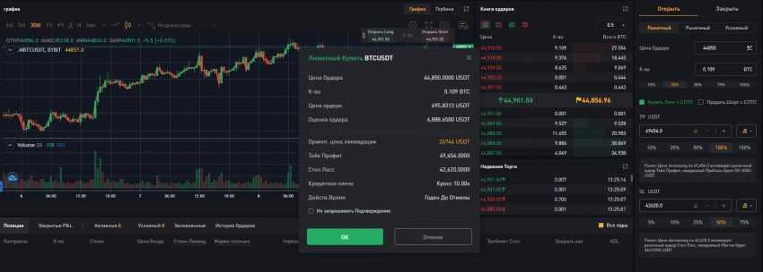 Справа от графика располагается Книга ордеров и торговая панель, на которой и выставляются все данные сделки: тип ордера, кредитное плечо, триггерная цена, сумма контракта. Там же и расположены кнопки «Купить» и «Продать».