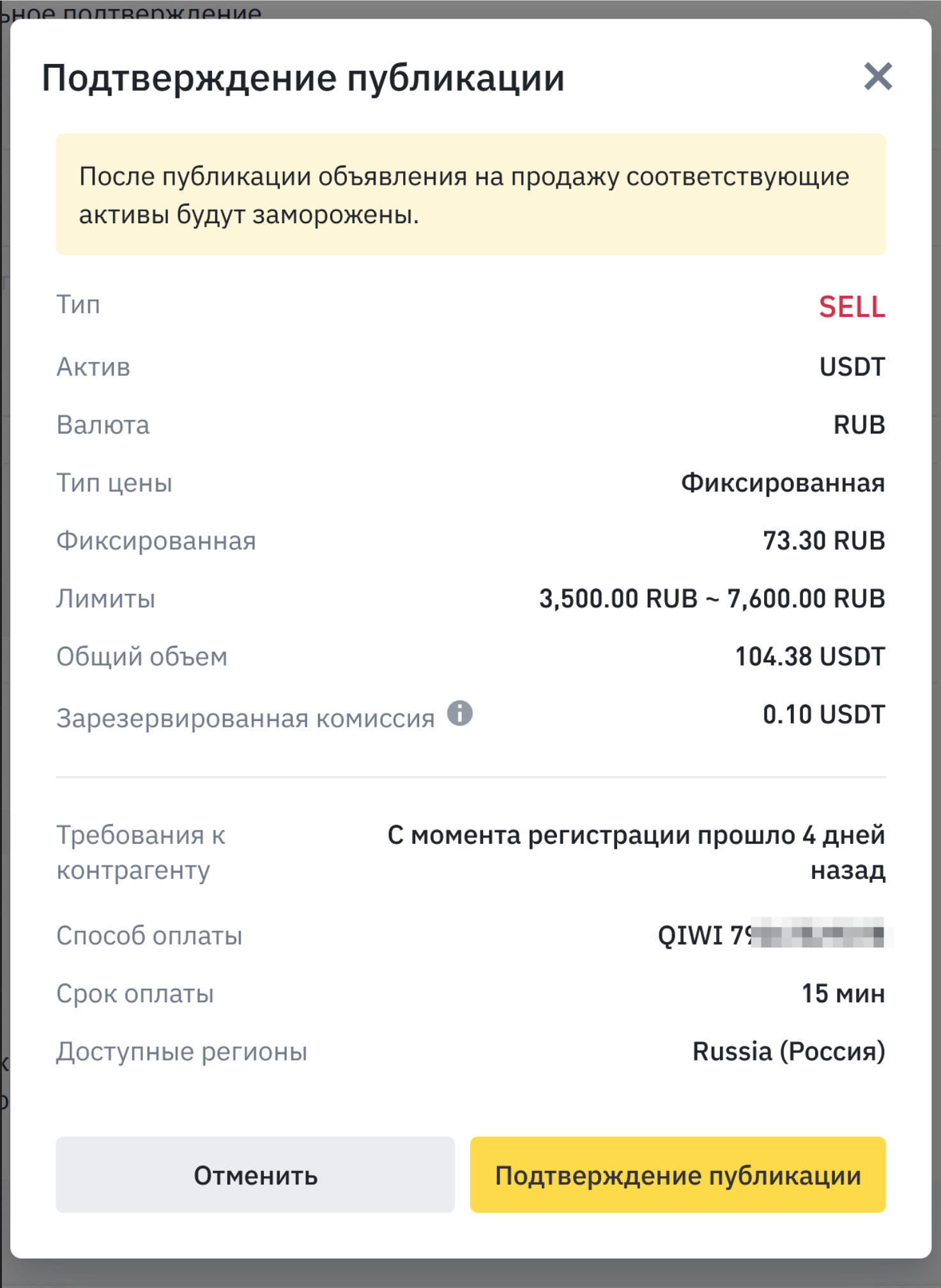 Объявление на продажу USDT за рубли успешно размещено.