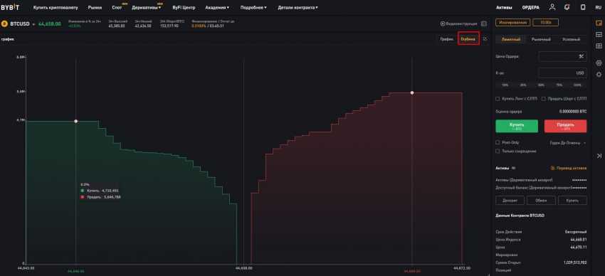 Кроме графика цены, ByBit также предлагает трейдеру изучить глубину рынка по объему открываемых ордеров.
