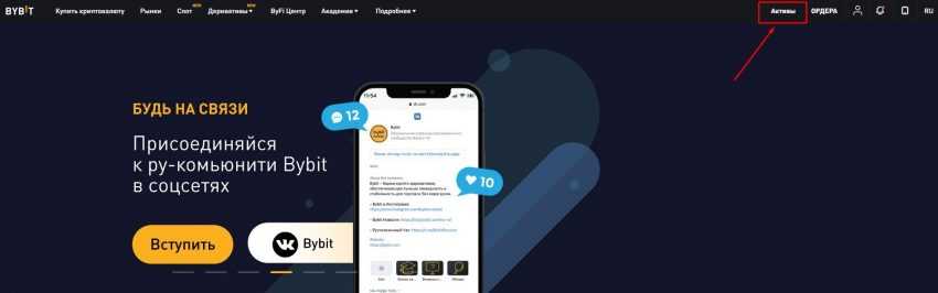 Если у вас уже есть какая-либо криптовалюта, которую поддерживает ByBit, то вам достаточно перевести ее на свой биржевой кошелек. Для этого после входа в личный кабинет перейдите по вкладке «Активы» в верхнем меню.