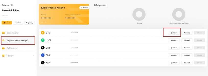 Выберите аккаунт (спотовый или деривативный) и криптовалюту, которую хотите пополнить. Напротив выбранной крипты нажмите «Депозит».