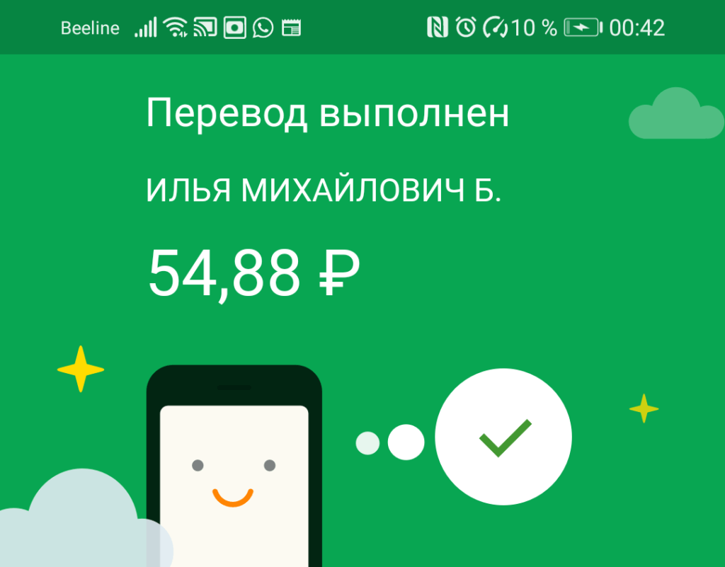 .. где в первом случае 89ХХХХХХХХ – это номер телефона человека, а во втором случае 1234ХХХХХХХХ7890 — его карта. 10 на конце – это условная сумма перевода (у вас должна быть эта сумма на карте).