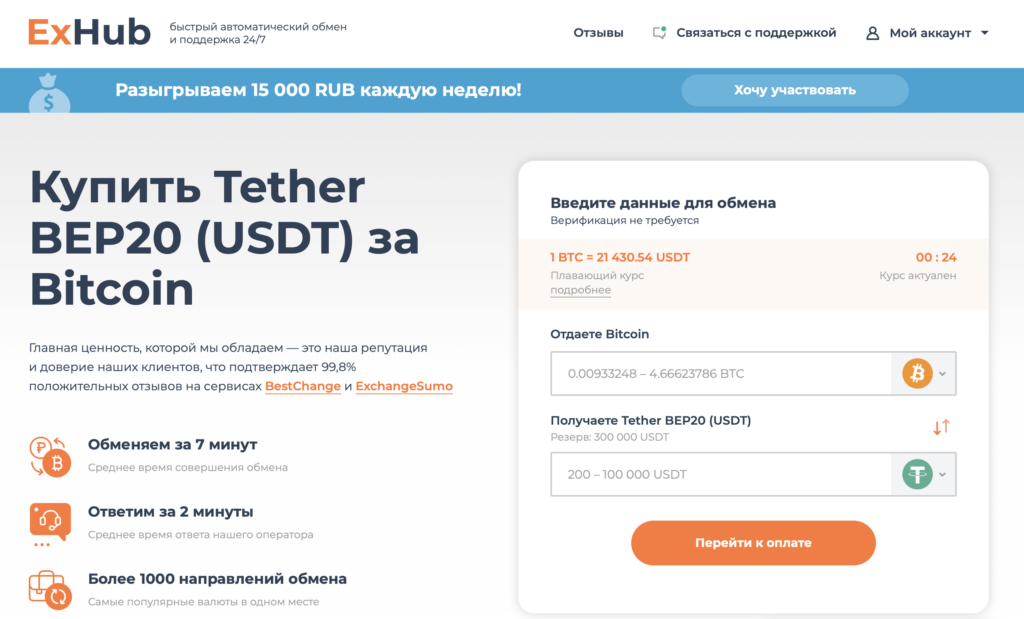 Автоматический обменник крипты EXHUB. Работает с 2018 года. Редакция холдера написала в службу поддержки ExHub и получила ответ в течении 6 минут. В обменном пункте доступно более 60 пар. В списке размена есть фиатная валюта и криптовалюта на разных сетях.