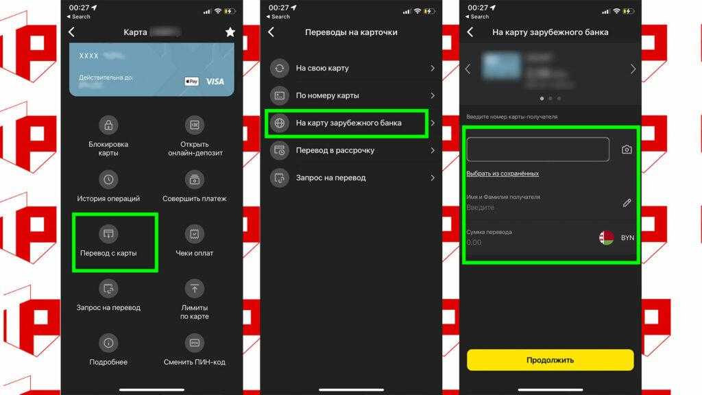 Еще один известный мне перевод с карты на карту из Беларуси в Польшу – «Приорбанк». Этот способ работает только с мобильным приложением. Заходите в приложение «Приорбанк», выбираете свою карту, затем «Перевод с карты», затем «На карту зарубежного банка», вводите данные карты (можно выбрать BYN или USD), приложение сразу покажет вам комиссию за перевод (комиссия небольшая). Учтите, что необходимо знать имя и фамилию получателя на латинице (как на карте).