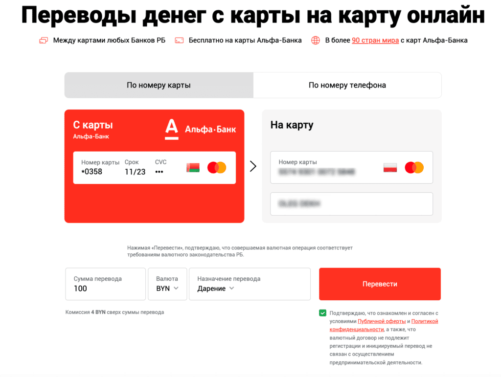 Есть лайфхак для тех, кто хочет перевести деньги из Беларуси в Польшу. Вы можете сделать это с помощью карты Альфа-Банк. С карты Альфа-Банк можно перевести на любую польскую карту прямо в приложении или прямо на сайте переводов с карты «Альфы». Просто вводите номер карты своей, номер карты получателя (+ обязательно его имя и фамилию как на карте). Дальше указываете сумму, цель (в моем случае я всегда выбираю «Дарение»), ставите «галочку», что ознакомлены с условиями и переводите сумму. Обычно деньги приходят в течение часа, реже в течение 20-ти минут. Для примера указал сумму 100 белорусских рублей и, как вы видите, комиссия составила 4 рубля или 4%.