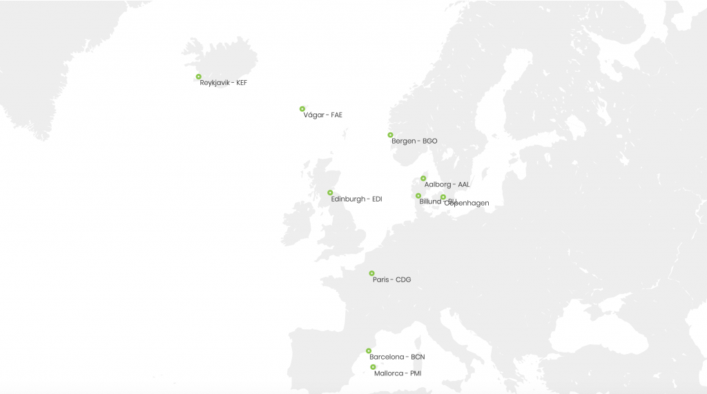 Прямыми рейсами можно улететь в такие шенгенские города: Рейкьявик (IS), Копенгаген (DK), Берген (NO) и ещё пару датских городов: Биллунд и Ольборг. Летом ещё можно улететь прямыми в Барселону, Пальма-де-Майорку и Гран-Канарию (ES), но это будет ну очень дорого.