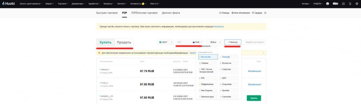 - Перейдите на страницу Huobi P2P. Переключатель над списком предложений должен быть установлен в положение «Купить».