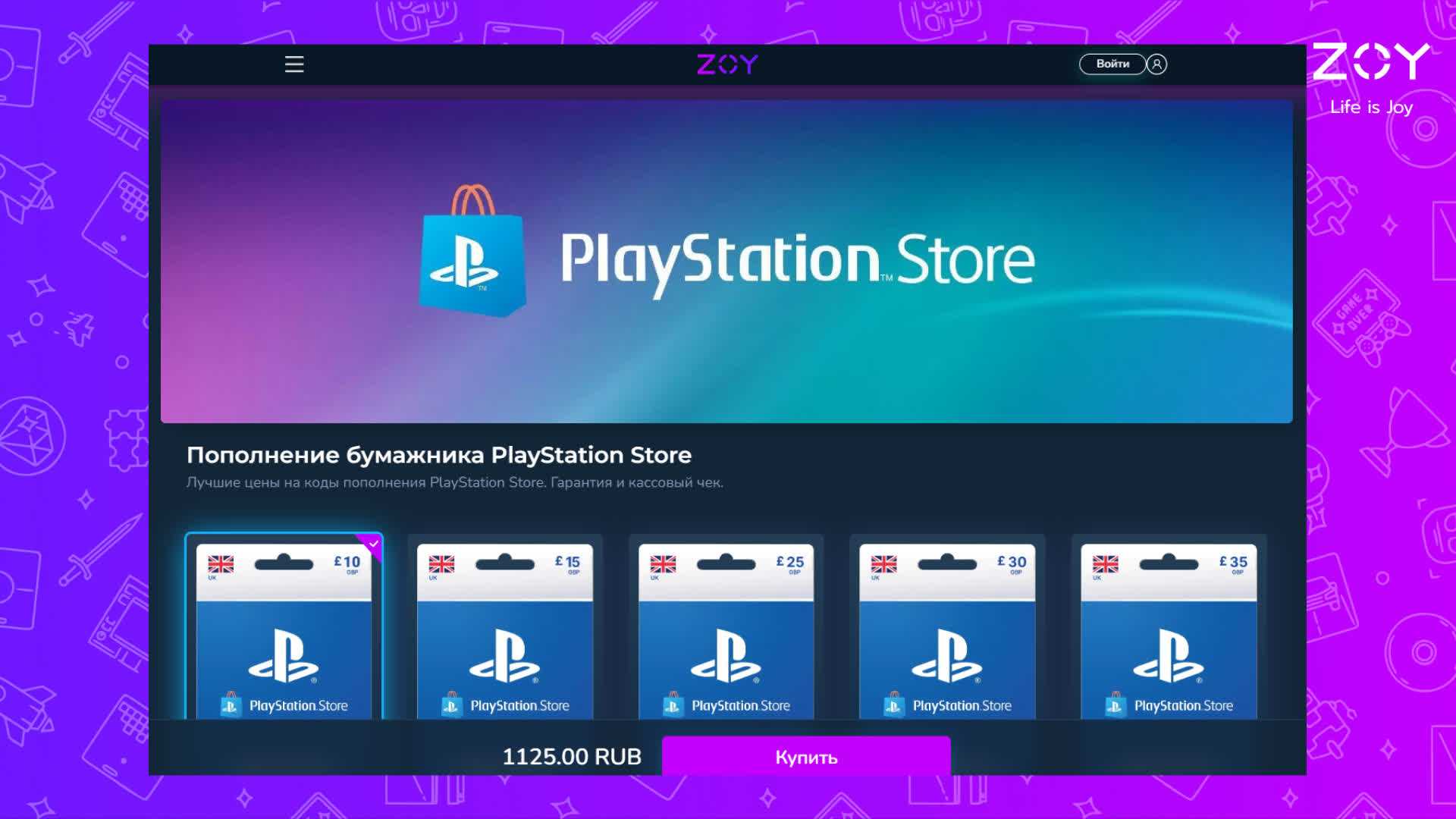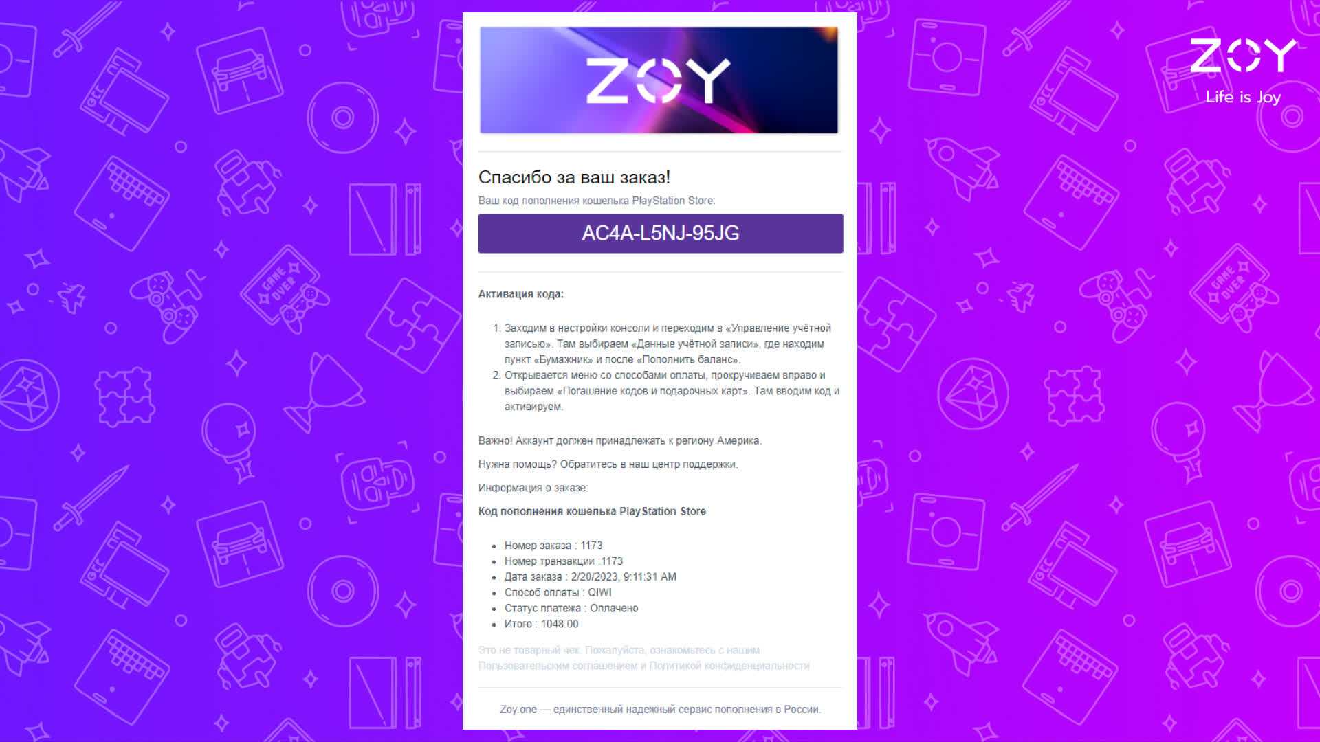 Для пополнения баланса вашего аккаунта в PlayStation Store, вы можете воспользоваться сервисом ZOY. Вам необходимо выбрать желаемый регион, номинал ваучера и оплатить покупку любым из предложенных способов.